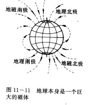 一个能在水平面内自由转动的磁针,静止时北极指北,南极指南,世界各地基本如此,这是为什么呢?原来地球本身是一个巨大的磁体,地磁北极在地理南极附近。地磁南极在地理北极附近。在地球周围的空间里存在着磁场,叫做地磁场,地磁场的磁感线从地磁北极出发到地磁南极(图11-11)。磁针指南北.就是因为受到地磁场的作用。